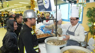 Presiden Direktur PTFI Tony Wenas beserta manajemen melayani pemberian makanan bagi karyawan yang tinggal di kawasan Ridgecamp, pada 7 April 2024. (Foto: Dok/PTFI)