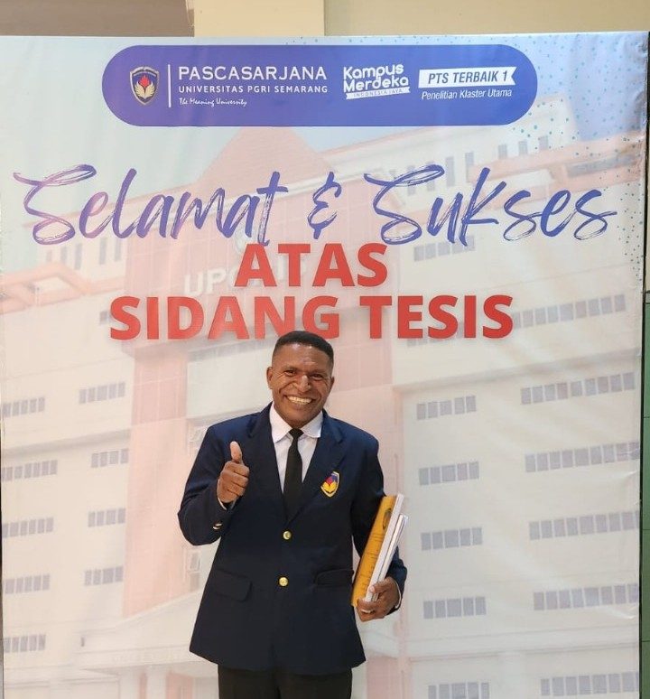 Rasa haru dan gembira tak terbendung di wajah pria asal Kampung Pedam, Distrik Okbab, Kabupaten Pegubin itu. Sebab berkat kerja keras, disiplin dan dukungan banyak pihak, ia berhasil mempertahankan tesisnya di depan para penguji selama satu jam.