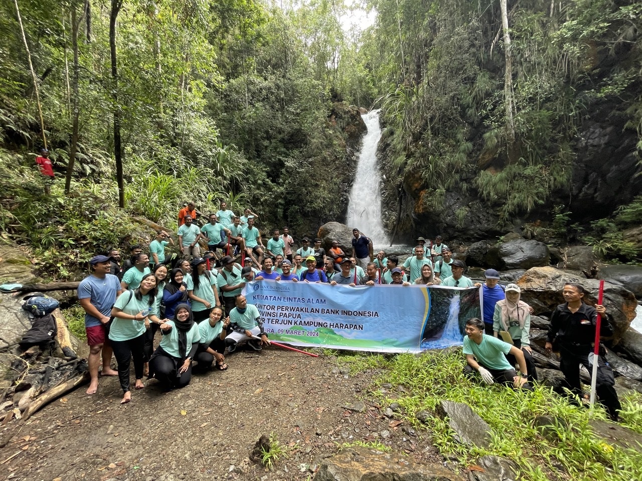 Setelah penyerahan PSBI, dilanjutkan kegiatan lintas alam ini hingga Air Terjun Kampung Harapan. Dalam kegiatan lintas alam tersebut, pegawai KPw BI Papua juga melakukan bersih-bersih trek sepanjang aliran sungai dengan cara memungut sampah-sampah hingga Air Terjun Kampung Harapan.
