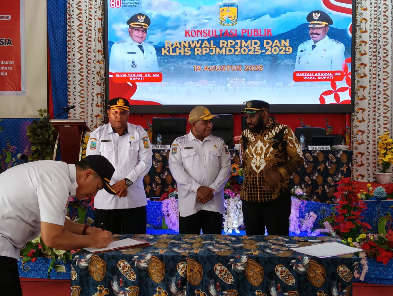 PAPUAINSIDE.ID, ILAGA— Bupati Elvis Tabuni membuka forum konsultasi public Rencana awal Rencana Pembangunan Jangka Menengah daerah (RPJMD) dan Konsultasi Publik I Penyusunan kajian lingkungan hidup strategis rencana pembangunan jangka menengah daerah (KLHS RPJMD) Kabupaten Puncak Tahun 2025-2029 yang digelar Badan Perencanaan Pembangunan Daerah (Bappeda) Puncak di Aula Negelar, Ilaga, Rabu (13/08/2025).