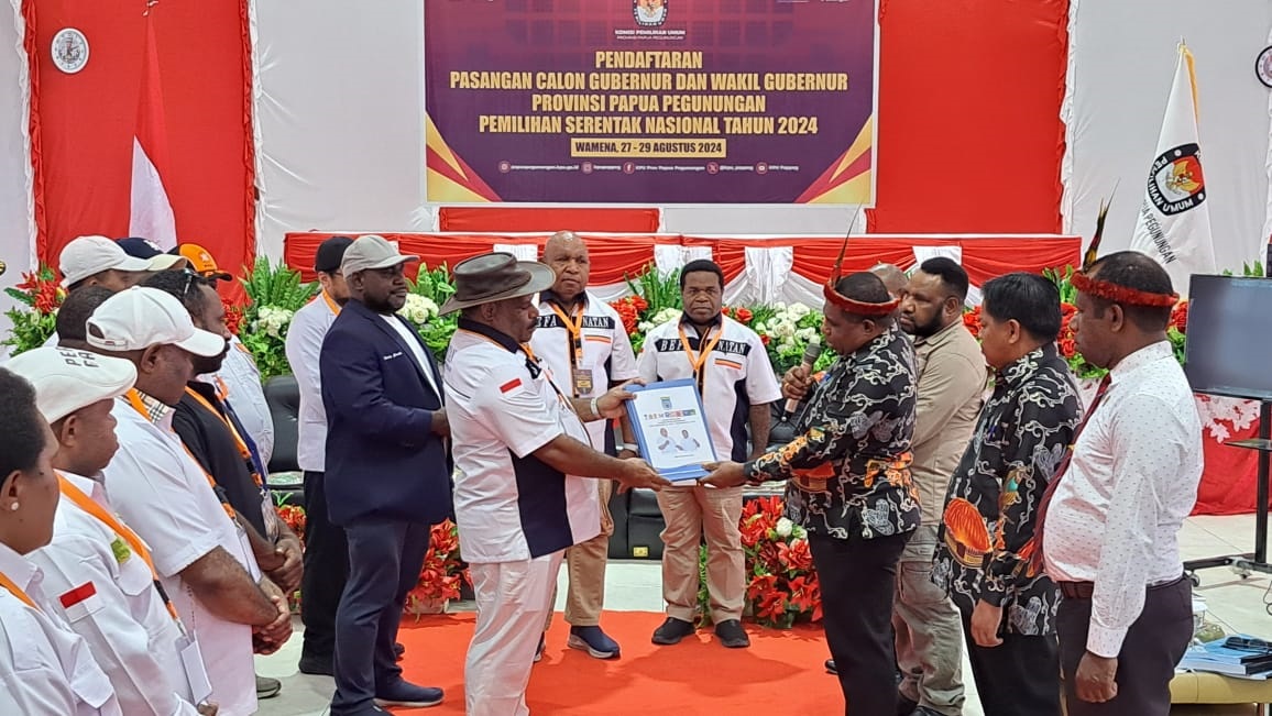 PAPUAinside.id, WAMENA—Pasangan Bakal Calon Gubernur (Bacagub) dan Bakal Calon Wakil Gubernur (Bacawagub) Provinsi Papua Pegunungan, Befa Yigibalom dan Nathan Pahabol resmi mendaftar ke KPU Provinsi Papua Pegunungan, Rabu (28/8/2024).