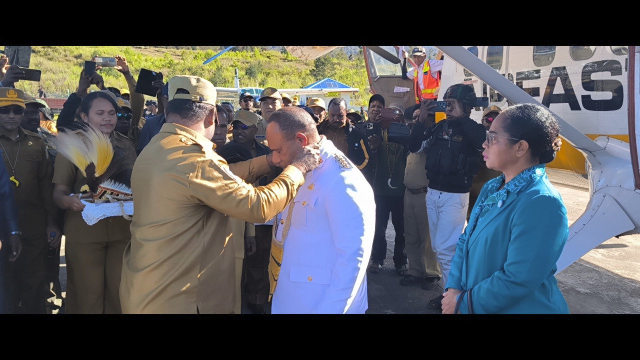 PAPUAINSIDE.ID, ILAGA- Masyarakat Puncak bersama Forkopimda menyambut kedatangan PJ Bupati Puncak Nenu Tabuni S,Sos yang didampingi istri Ny Fransina Maria Fau’bun di Bandara Aminggaru Ilaga, Senin (12/08/2024).