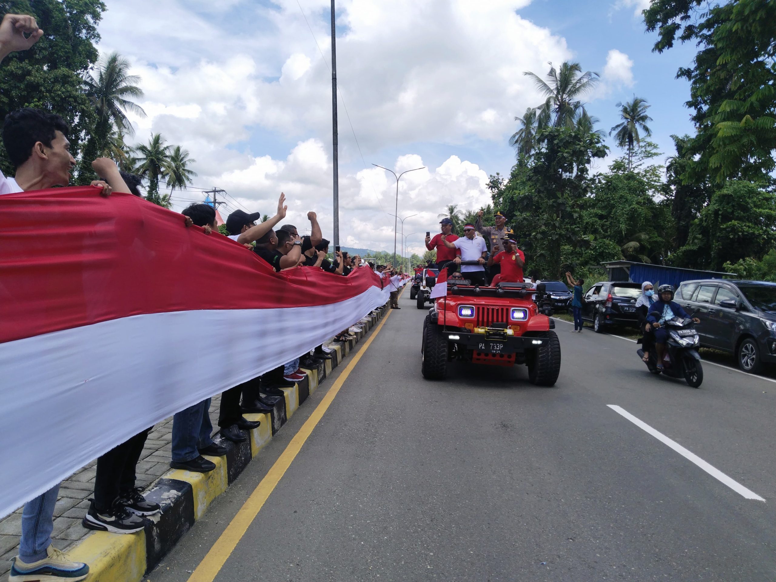 Warga Kota Jayapura antusias membentangkan kain merah putih sepanjang 10,76 Km. (foto: Faisal Narwawan)