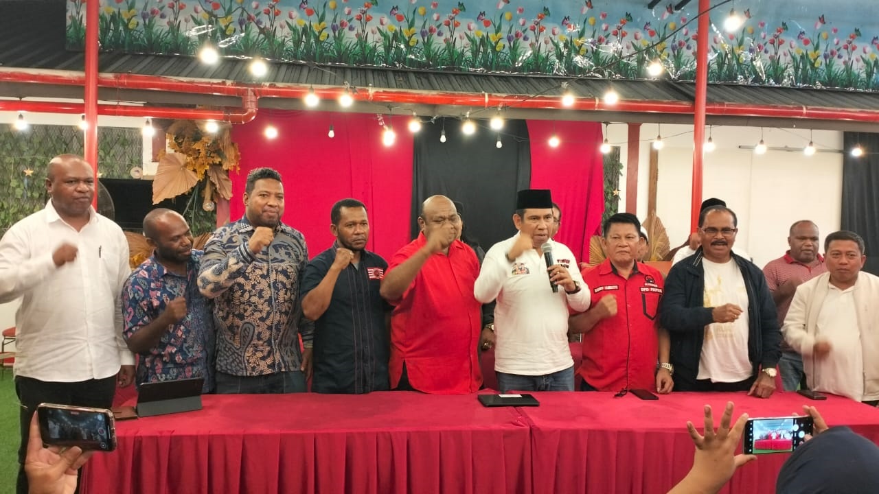 Ketua Tim Pemenangan BTM–CK, Mukri Hamadi, didampingi perwakilan partai politik pengusung, saat konferensi pers, usai mengumumkan hasil sementara PSU Pilkada Papua di Jayapura, Rabu (6/8/2025) malam. (Epen Kataren for Papuainside.id)