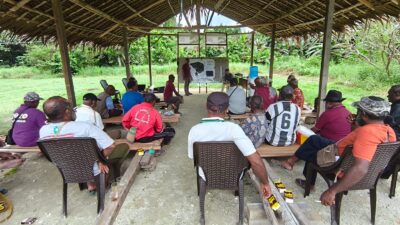 Perwakilan Mitra BUMMA, Piter Roki Aloisius, ketika memfasilitasi kegiatan menoken pendokumentasian dan pemetaan tata ruang adat Suku Namblong. (Foto: Papuainside.id/Makawaru da Cunha)