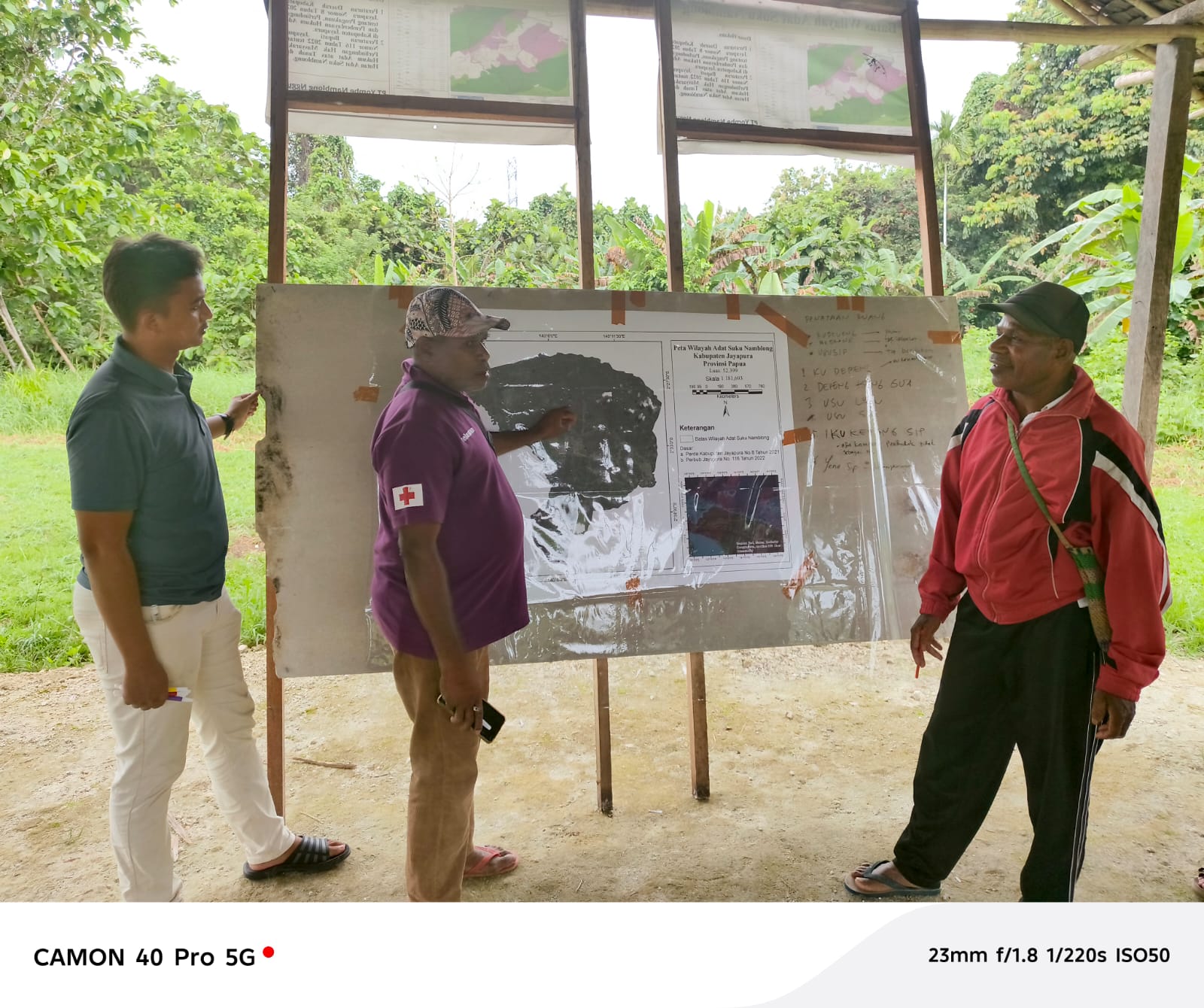 Perwakilan Mitra BUMMA, Piter Roki Aloisius, ketika memfasilitasi kegiatan menoken pendokumentasian dan pemetaan tata ruang adat Suku Namblong. (Foto: Papuainside.id/Makawaru da Cunha)