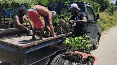 Staf Sub Unit Rehabilitasi Hutan BUMMA PT Yombe Namblong Nggua, Alex Tacuari, memindahkan bibit dari rumah pembibitan ke lokasi penanaman di Kampung Kuipons.