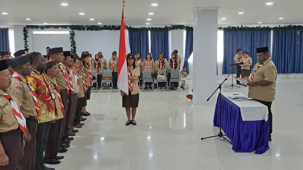 PAPUAINSIDE.ID, WAMENA–Bupati Jayawijaya Atenius Murip mengukuhkan dan melantik pengurus pengurus Gerakan Pramuka Kwartir Cabang Jayawijaya Periode Tahun 2025-2030 di Sasana Wio, Kantor Bupati Jayawijaya, Kamis (18/12/2025).