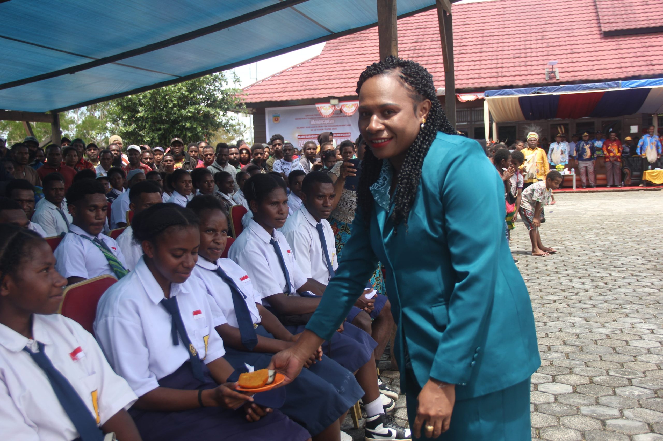 Ketua TP PKK Pegunungan Bintang Susana Maria Apaseray, S.IP memberikan kue ulang tahun kepada siswi SMP yang menghadiri peringatan HUT-22 Kabupaten Pegunungan Bintang. (foto: Aquino Ningdana)