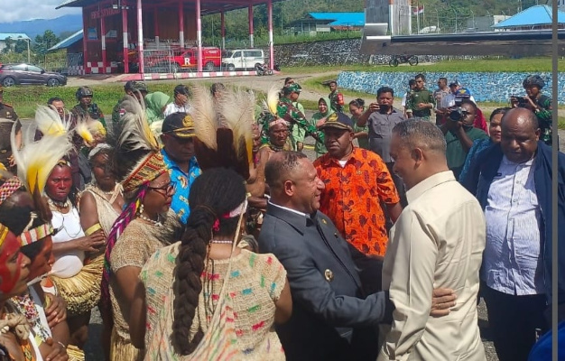 Kedatangan PJ Velix Wanggai disambut Bupati Pegunungan Bintang Spei Yan Bidana di Bandara didampingi Sekda Pegunungan Bintang Jeni Linthin SH, M.Si.