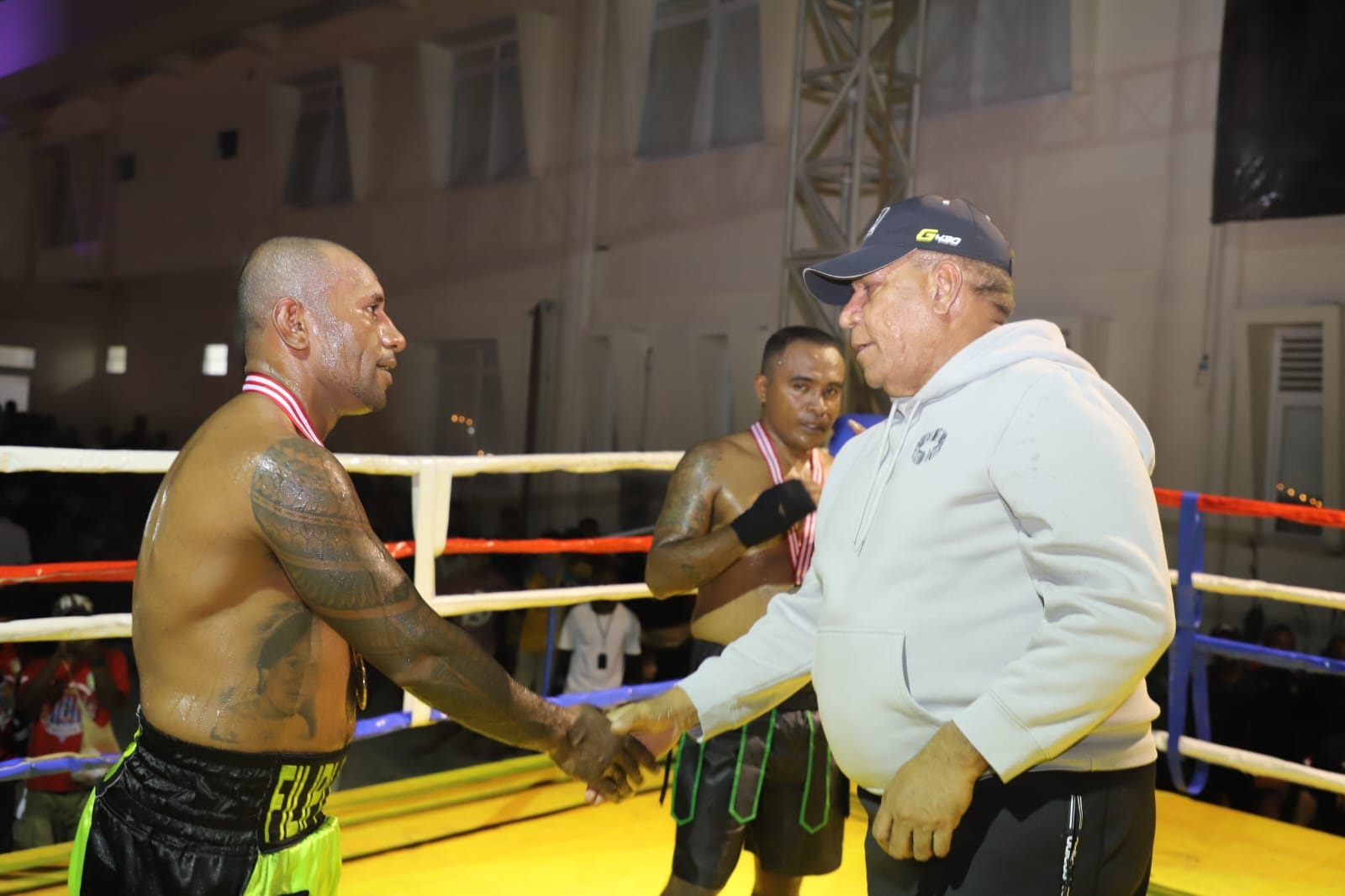 Paulus Waterpauw menjabatangan Geisler Ap, didampingi John Rahmat Renwarin, ketika tampil di East Phoria Sport Championship by Paulus Waterpauw di Papua Youth Creative Hub (PYCH), Jalan Baru Youtefa Abepura, Kota Jayapura, Minggu (23/6/2024) malam. (Foto: Tim Paulus Waterpauw)