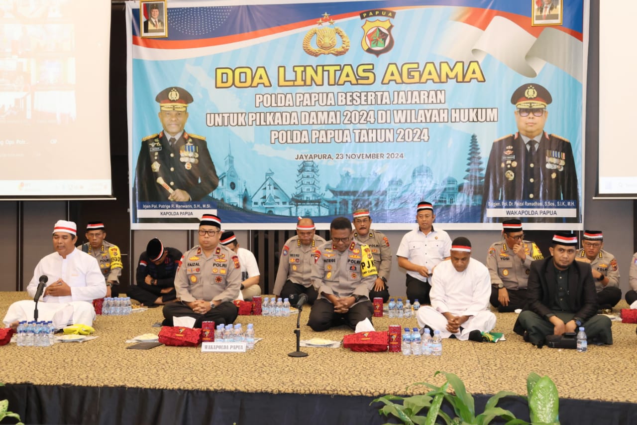 Kapolda Papua Irjen Pol. Patrige Renwarin dan Wakapolda Papua Brigjen Pol. Dr. Faizal Ramadhani hadir langsung dalam kegiatan tesebut.  “Ini bukan sekedar sebuah rutinitas seremonial, melainkan wujud nyata kebersamaan dan persatuan, di mana semua, dengan berbagai latar belakang agama, suku dan budaya, bersatu dalam doa untuk menyukseskan Pilkada 2024 di Tanah Papua” ujar Wakapolda Papua Brigjen Pol. Dr. Faizal Ramadhani.