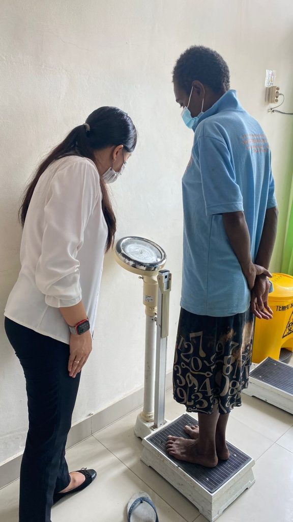 Tim Dokter di Puskesmas Kwamki Baru melakukan monitoring kesehatan dengan melakukan timbang badan guna menghitung perkembangan kesehatan pasien. (Foto: PTFI)