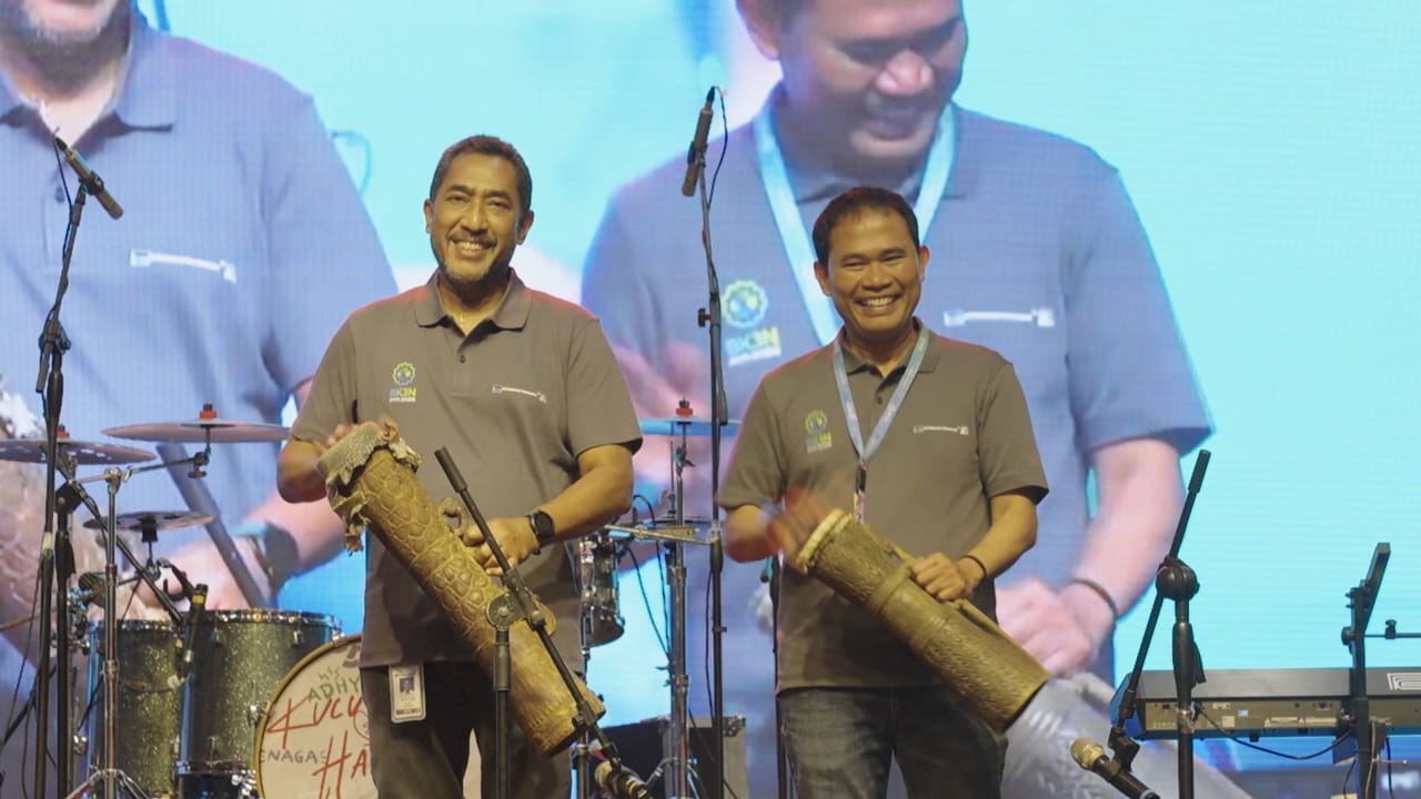 Pemukulan tifa menandai berakhirnya Bulan Keselamatan dan Kesehatan Kerja Nasional (BK3N) di Sporthall, Mile Post 68, Tembagapura (23/2/2025). (Dari kiri ke kanan) Executive Vice President Site Operations/Kepala Teknik Tambang PTFI Carl Tauran, Ketua Panitia BK3N – Manajer Grasberg Block Caving