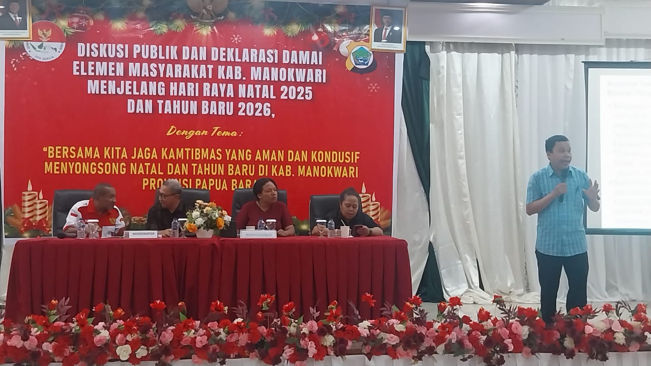 PAPUAINSIDE.ID, MANOKWARI—DPD Gerakan Cinta Indonesia (GERCIN) Papua Barat bersama dengan tokoh masyarakat dan elemen sipil lainnya, hari ini Jumat, 5 Desember 2025 menyelenggarakan diskusi publik yang dirangkai dengan deklarasi damai bersama untuk menjaga keamanan dan ketertiban masyarakat (kamtibmas) menjelang perayaan Natal 2025 dan Tahun Baru 2026 atau Nataru di Manokwari, Provinsi Papua Barat.