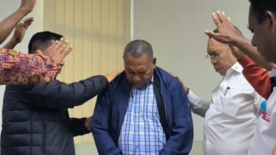 Sejumlah Hamba Tuhan dari GPDI, mendoakan salah satu anggota jemaatnya, Aryoko Rumaropen, yang maju sebagai Calon Wakil Gubernur Papua, mendampingi Calon Gubernur Papua Matius D Fakhiri. (Foto: Tim MARI-YO)