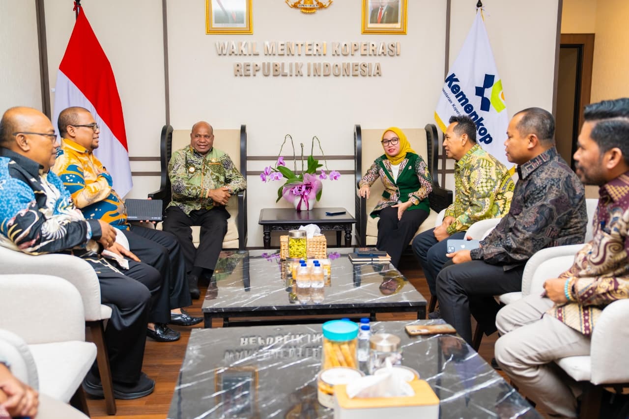 Gubernur Papua Matius D. Fakhiri bertemu Wakil Menteri Koperasi Farida Farichah di Jakarta, Kamis (5/2/2026), membahas percepatan pembangunan Koperasi Merah Putih di seluruh wilayah Papua. (Foto: Humas Gubernur Papua)