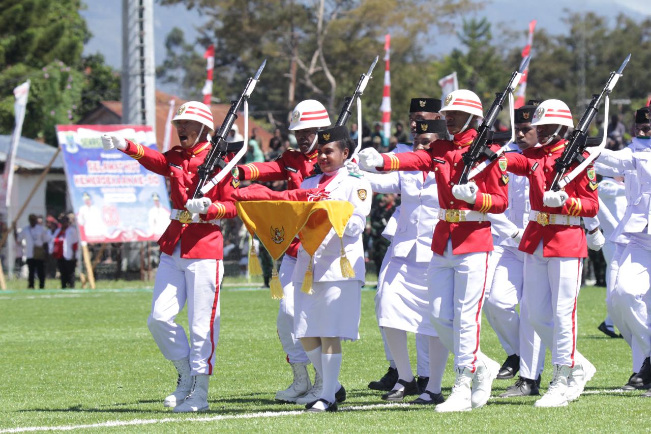 Upacara yang berlangsung khidmat ini diikuti oleh TNI/Polri, ASN, BUMN/BUMD, para pelajar setingkat SD hingga perguruan tinggi, dan berbagai lapisan masyarakat di Wamena, ibu kota provinsi Papua Pegunungan. **