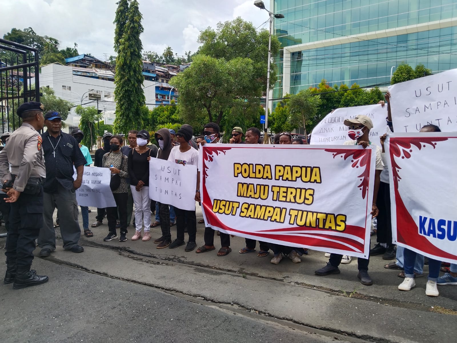 Massa yang melalukan aksi damai ke Polda Papua menuntut kasus asusila yang diduga melibatkan mantan Bupati Biak diproses hukum sampai tuntas. (foto: Faisal Narwawan)