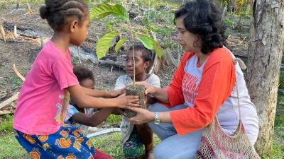 Nokeners Samdhana Yuniken Mayangsari, bersama anak-anak menanam pohon di Balai Latihan Kerja Komunitas (BLKK) di Kampung Hyansi, Distrik Kemtuk Gresi, Kabupaten Jayapura, Provinsi Papua. (Foto: Makawaru da Cunha/Papuainside.id)
