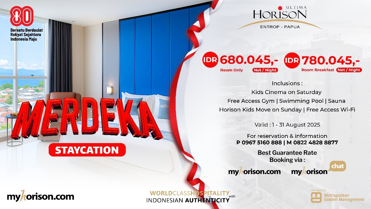 “Promo ini kami hadirkan, agar masyarakat bisa merayakan momen kemerdekaan dengan cara yang menyenangkan sekaligus berkesan. Selain menikmati staycation nyaman di Horison Ultima Entrop, kami juga mengajak tamu untuk merasakan semangat 17 Agustus melalui beragam perlombaan seru yang penuh kebersamaan,” ujar General Manager Horison Ultima Entrop Jayapura, Dede Fahruroji melalui Siaran Pers, Selasa (5/8/2025).