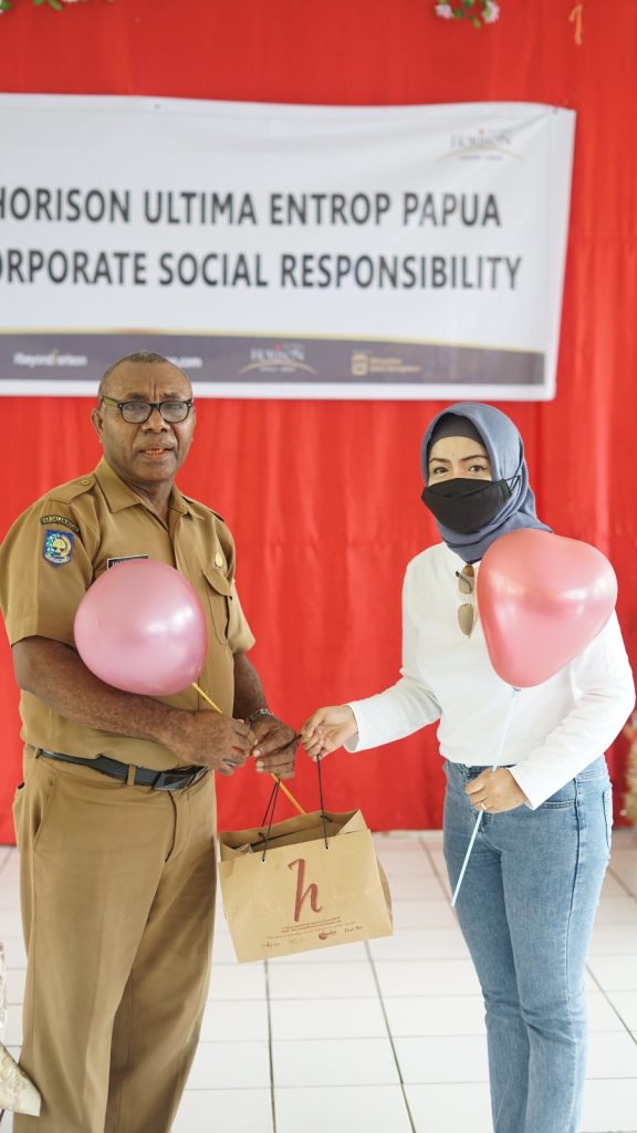 General Manager Hotel Horison Ultima Entrop, Hardika Septi Putri, membagikan balon berbentuk hati kepada Kepala Panti Jompo Bina Usia Lanjut di Sentani, Papua. (Foto: Hotel Horison Ultima Entrop)