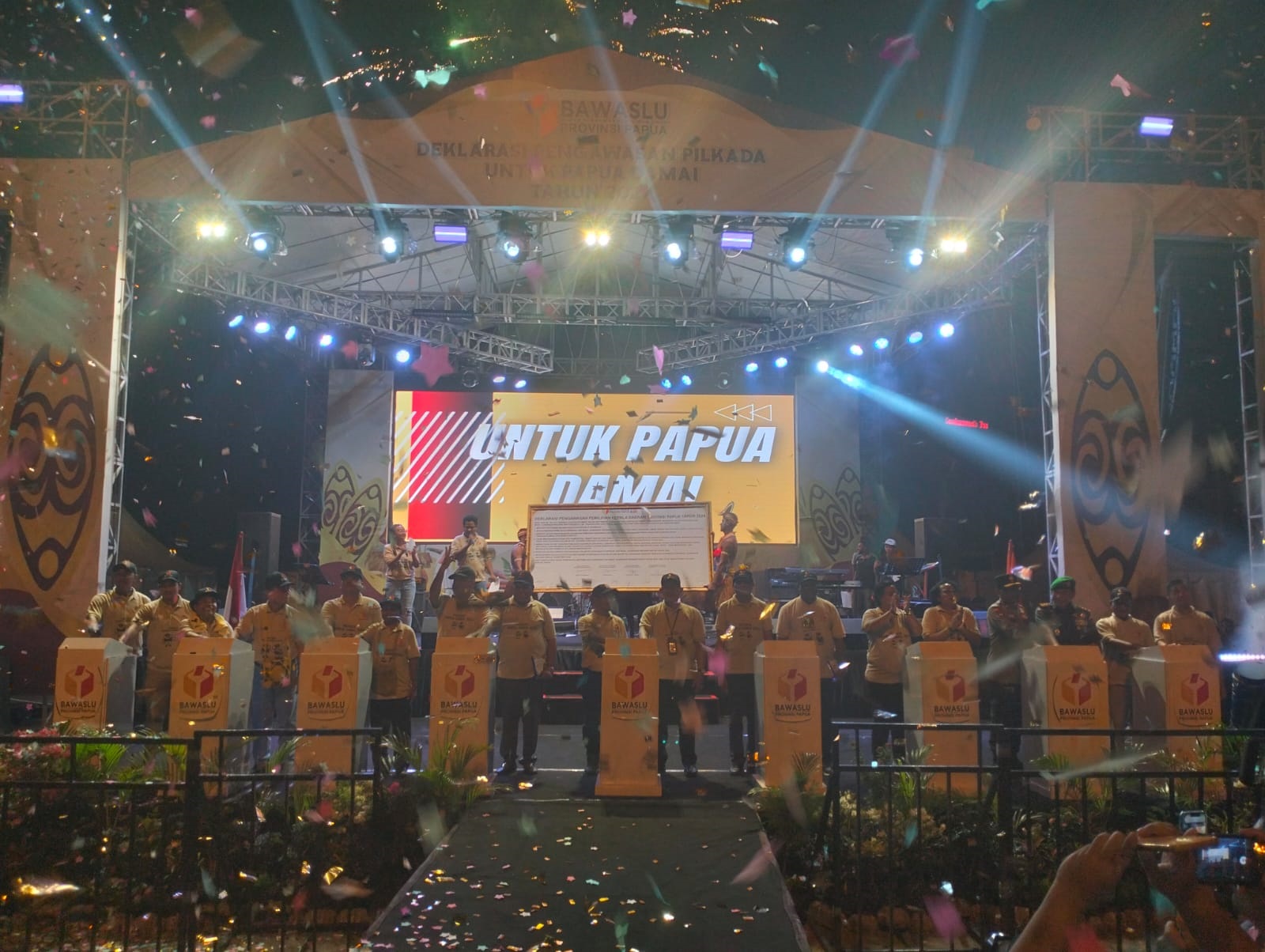 Naskah deklarasi pengawasan Pilkada untuk Papua damai tahun 2024, dibacakan oleh Koordinator Divisi Pencegahan, Partisipasi Masyarakat dan Hubungan Masyarakat Bawaslu Papua, Yofrey Piryamta Kebelen, diikuti Calon Gubernur Provinsi Papua Nomor Urut 1 Benhur Tomi Mano dan Yermias Bisai dan Calon Gubernur Provinsi Papua Nomor Urut 2 Matius D Fakhiri dan Aryoko Rumaropen, Bawaslu Papua, Bawaslu RI, Penjabat Gubernur Provinsi Papua, Pangdam XVII Cenderawasih, Danlanud Silas Papare, Danlantamal X Jayapura, Kapolda Papua, Kajati Papua dan KPU Papua.