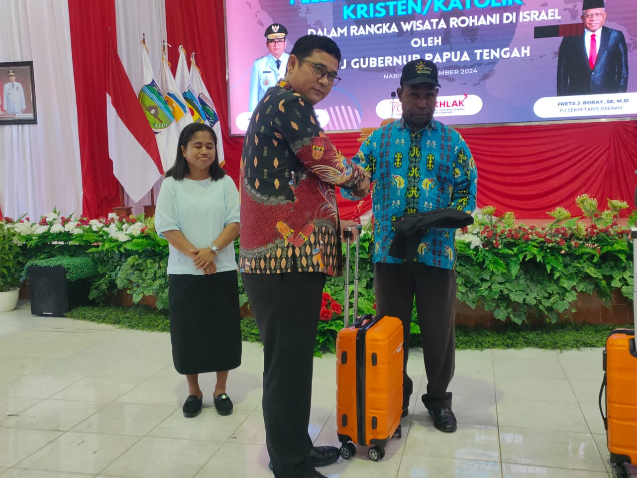 PAPUAINSIDE.ID, NABIRE—Pemerintah Provinsi Papua Tengah secara resmi melepas 40 pemimpin umat Kristen Protestan dan Katolik mengikuti wisata rohani ke Israel, ditandai dengan penyematan topi dan penyerahan koper secara simbolis oleh Penjabat Gubernur Papua Tengah, Anwar Harun Damanik, kepada dua peserta wisata rohani di Aula Kantor Gubernur, Nabire, Papua Tengah, Jumat (20/12/2024).