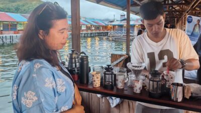 Kopi Tuli Muhammad Rival Aras melayani pengunjung pada peringatan Hari Noken dan Hari Ibu di Cafe Isasai, Jayapura, Sabtu (20/12/2025). (Foto: Papuainside.id/Makawaru da Cunha)