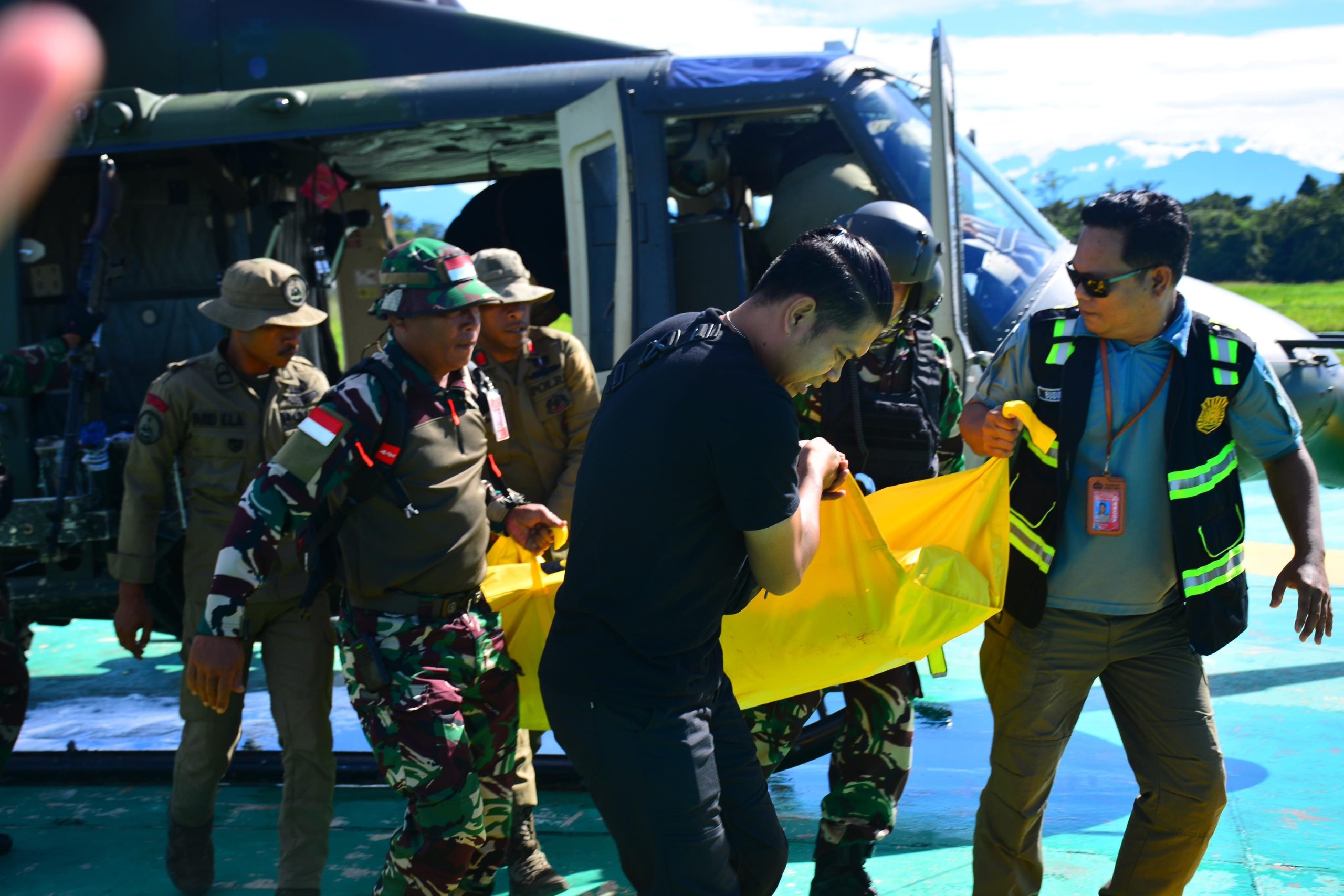 Kepala Operasi Damai Cartenz Kombes Pol. Dr. Faizal Ramadhani menjelaskan, evakuasi dilakukan menggunakan sarana Heli Bell Penerbad.
