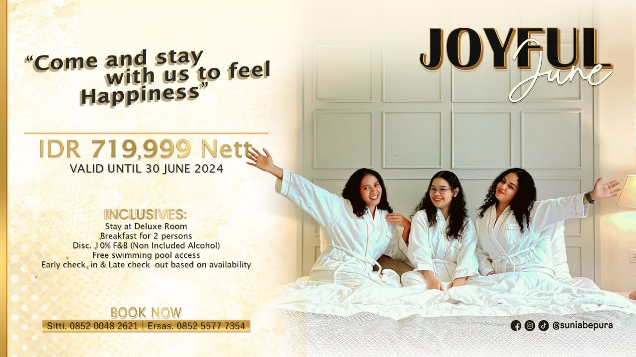 Penawaran promo kamar Joyful June & The Weekend Sudah termasuk dengan tipe kamar deluxe beserta sarapan untuk 2 (dua) orang, akses kolam renang, akses wifi, discount 10 % untuk makanan dan minuman di Restaurant 38, Early check – in saat kamar tersedia dan Kid’s Activity Minggu pukul 09.00 WIT.