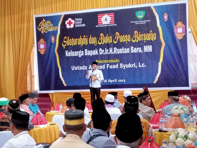 PAPUAinside.id, JAYAPURA—Keluarga Dr Ir Rustan Saru, MM berkolaborasi dengan Palang Merah Indonesia (PMI) Kota Jayapura, BPD Kerukunan Keluarga Sulawesi Selatan (KKSS) Kota Jayapura dan Kerukunan Keluarga Maros (KKM) Kota Jayapura, menggelar silaturahmi dan buka puasa bersama di PTC Entrop, Kota Jayapura, Papua, Selasa (18/4/2023).
