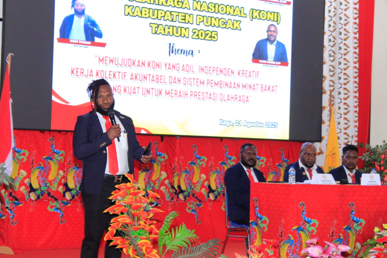 PAPUAINSIDE.ID, ILAGA— Kem Magai dilantik menjadi Ketua KONI Kabupaten Puncak 2025-2029 oleh Ketua Umum Komite Olahraga Nasional Indonesia (KONI) Papua Tengah Yosua Tipagau, di Aula Negelar, Ilaga, Kabupaten Puncak, Provinsi Papua Tengah, Jumat (22/08/2025), setelah terpilih secara aklamasi melalui Muskab (Musyawarah Kabupaten).