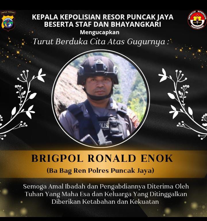 PAPUAINSIDE.ID, JAYAPURA – Seorang anggota Polres Puncak Jaya, Brigpol Ronald M. Enok, gugur ditembak oleh kelompok kriminal bersenjata (KKB) Bumiwalo Telenggen.