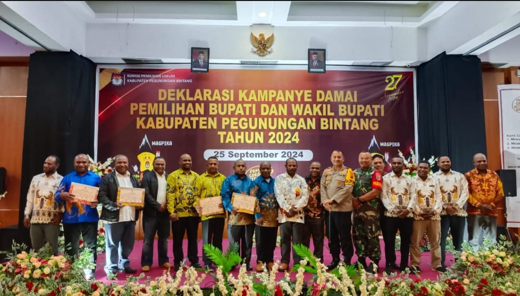 Deklarasi pemilihan tahun 2024 Calon Bupati dan Wakil Bupati Kabupaten Pegunungan Bintang yaitu pertama, mewujudkan pemilihan yang langsung, umum, bebas, rahasia, jujur dan adil kedua, melaksanakan kampanye pemilihan yang aman, tertib, damai berintegritas tanpa hoax, tanpa politisasi, SARA dan tanpa politik uang dan ketiga, melaksanakan kampanye pemilihan berdasarkan peraturan perundang-undangan yang berlaku.