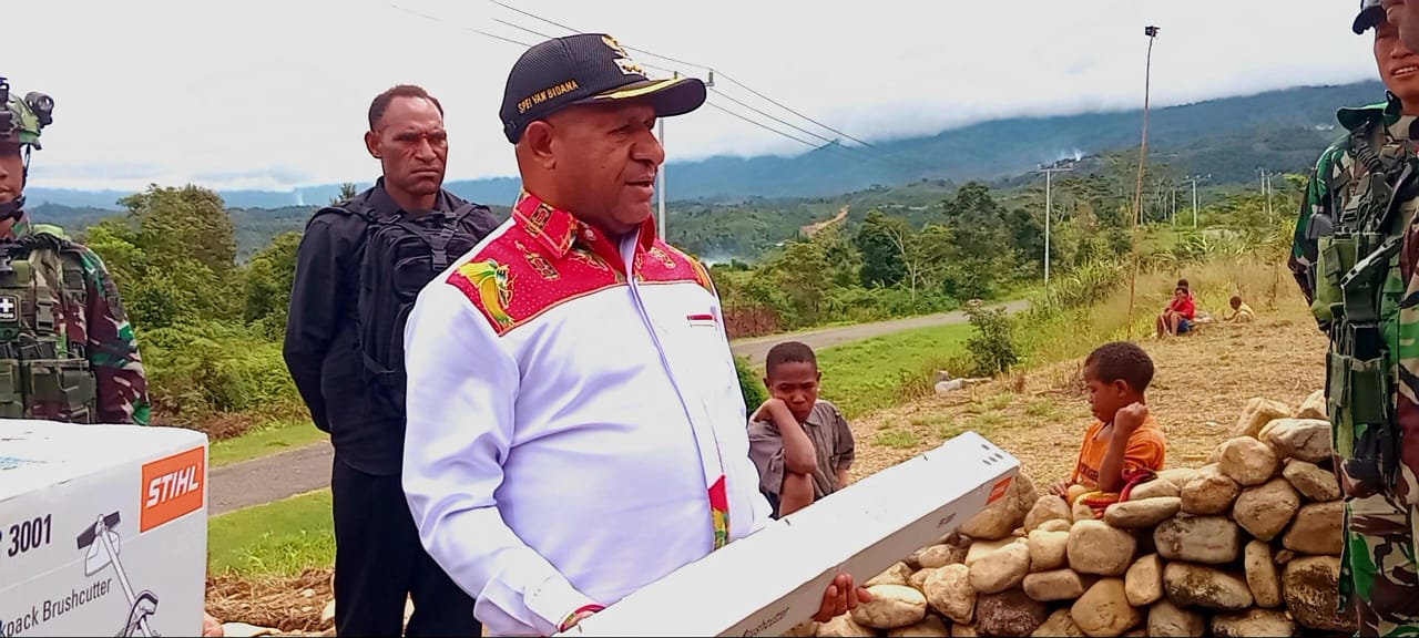 PAPUAINSIDE.ID, OKSIBIL—Bupati Pegunungan Bintang Spei Yan Birdana, ST, M.Si menyumbang dua mesin pembabat rumput saat mengunjungi lokasi Kodim 1715 Oksibil di Distrik Yapimakot, Senin (23/06/2025).