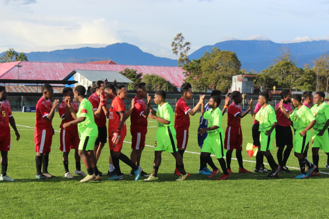 Kapten SSB YPK Bethlehem, Gibran Rakabuming Raka (jersei merah), berjabat tangan dengan pemain SSB YPK Yehuda sebelum pertandingan di Stadion Pendidikan, Wamena, Selasa (13/1/2026). (Foto: Papuainside.id/RF)