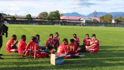 Kapten SSB YPK Bethlehem, Gibran Rakabuming Raka (merah), berbincang dengan pemain kedua tim saat jeda pertandingan di Stadion Pendidikan, Wamena, Selasa (13/1/2026). (Foto: Papuainside.id/RF)