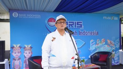 Kepala Perwakilan Bank Indonesia (kpWbi) Papua, Faturachman, menyampaikan sambutan kegiatan QRIS Jelajah Indonesia (QJI) Papua di sekitar wilayah Kota dan Kabupaten Jayapura 19 – 21 Juli 2024. (Foto: KPwBI Papua)
