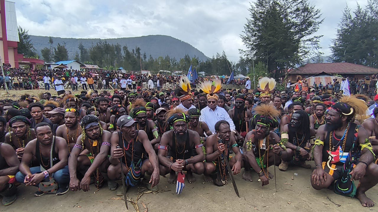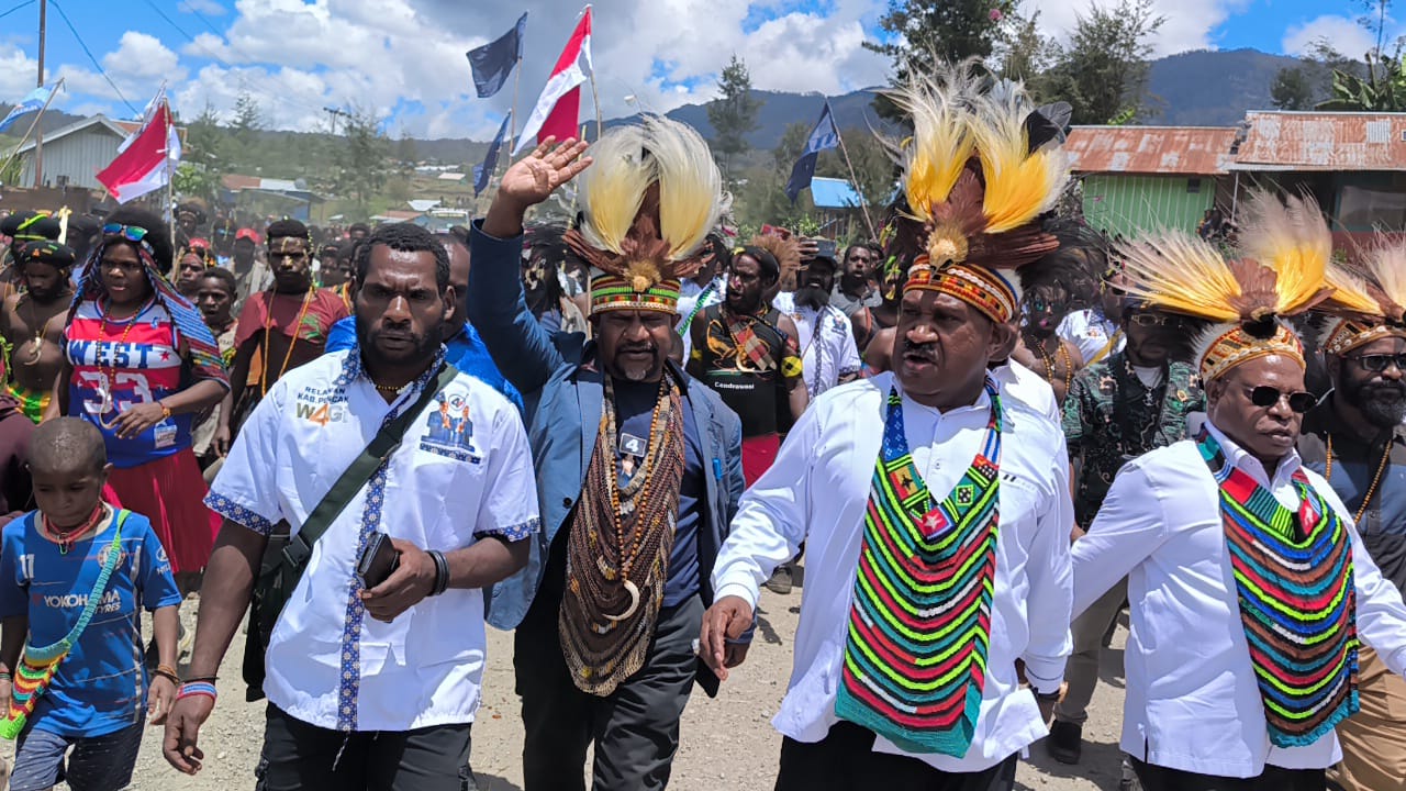 Kandidat Gubernur dan Wagub Papua Tengah 2024-2029 Willem Wandik-Aloysius Giyai bersama ribuan pendukungnya di Ilaga, Puncak. (foto: Tim Media WAGI)