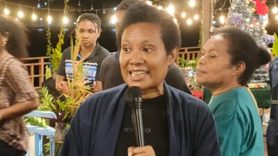 Usilina Epa, Pengelola Café Isasai, menjelaskan penyajian kuliner lokal Sentani pada kegiatan Menoken “Isi Noken Mama, Pangan Lokal dan Puisi” dalam rangka Hari Noken dan Hari Ibu 2025 di Waena, Kota Jayapura, Papua, Sabtu (20/12/2025). (Foto: Papuainside.id/Makawaru da Cunha)
