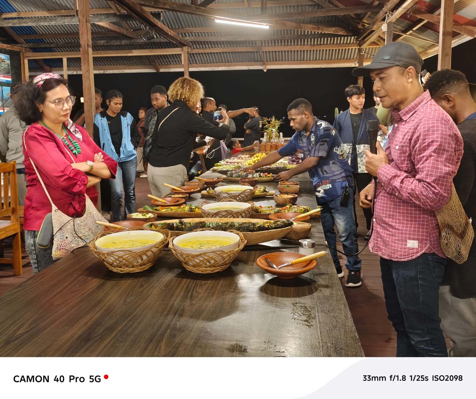 Beragam pangan lokal seperti ubi-ubian, keladi tumbuk (kamambra), sagu, serta ikan gabus segar dari Danau Sentani diolah dengan teknik memasak tradisional.