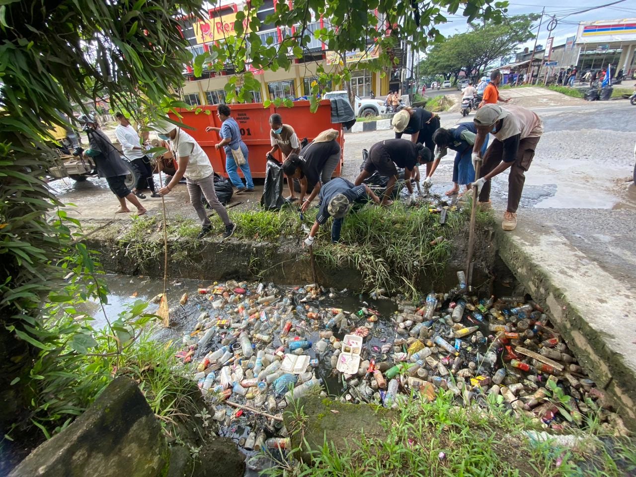 Komunitas Menoken Domberai masuk kedalam drainase, untuk memungut sampah plastik, ketika menggelar kegiatan menoken memperingati Hari Lingkungan Hidup Sedunia 2024 di Km 10, Kota Sorong, Papua Barat Daya, Sabtu (8/6/2024). (Foto: Dok/Komunitas Menoken Domberai)