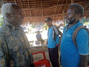 Direktur Operasional Umum BUMMA Namblong, Yusuf Kasmando, berbincang bersama anggota, usai kegiatan menoken jelang HUT ke-1 BUMMA Namblong di Kampung Pobaim, Distrik Nimboran, Kabupaten Jayapura, Jumat (10/11/2023). (Foto: Makawaru da Cunha/Papuainside.id)