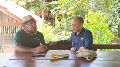 Kepala Bidang Kebudayaan Dinas Kebudayaan dan Pariwisata Kabupaten Jayapura, Fred Modouw, SSos, dan Koordinator The Samdhana Institute Papua Piter Roki Aloisius, ketika Menoken Mama Mama Kampung Abar Peluang, Tantangan dan Harapan Menuju Kampung Wisata di Kampung Abar, Distrik Ebungfauw, Kabupaten Jayapura, Provinsi Papua, Jumat (28/3/2025). (Foto: Makawaru da Cunha/Papuainside.id)