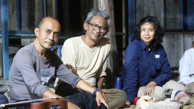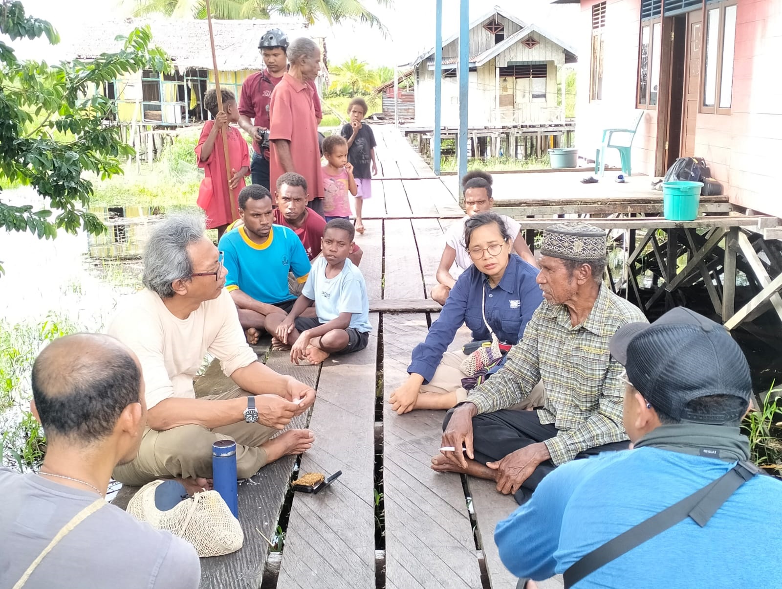 Nokeners Yogyakarta Ambrosius Ruwindrijarto (tengah, didampingi Nokeners Bogor Yuniken Mayangsari dan Koordinator The Samdhana Institute Papua Piter Roki Aloisius, ketika Menoken Pulang Kampung ke Kokoda 2024 di Kampung Birawako, Selasa (17/12/2024). (Foto: Komunitas Menoken)