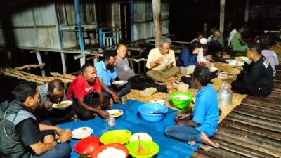 Suasana makan bersama di sela-sela Menoken Pulang Kampung ke Kokoda 2024 di Kampung Arbasina, Selasa (17/12/2024). (Foto: Makawaru da Cunha/Papuainside.id)