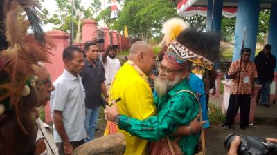 Sekjen KainKain Karkara Byak, Gerard Kafiar, menyambut Bawacagub Papua Aryoko Rumaropen, ketika Mubes ke-III KainKain Karkara Byak di Kabupaten Biak Numfor, Provinsi Papua, Sabtu (31/8/2034).(Foto: Tim MDF)