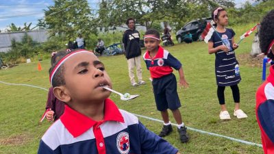 Siswa-siswi Papua Shine School Koya Koso mengikuti lomba gigit sendok memeriahkan HUT RI ke-80 Tahun 2025. (Foto: Dok/Papua Shine School Koya Koso)