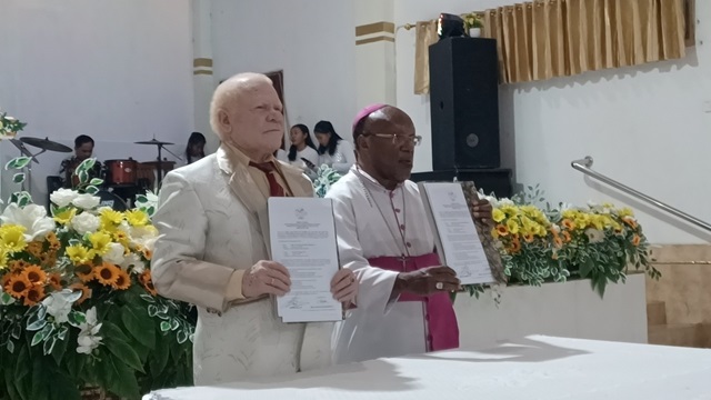 Ketua PGGP Papua yang baru, Pdt. M.P.A. Maury, S.Th, bersama Ketua PGGP sebelumnya, Mgr. Dr. Yanuarius Teofilus Matopai You, menunjukan berita acara pelantikan. (Foto: Istimewa)